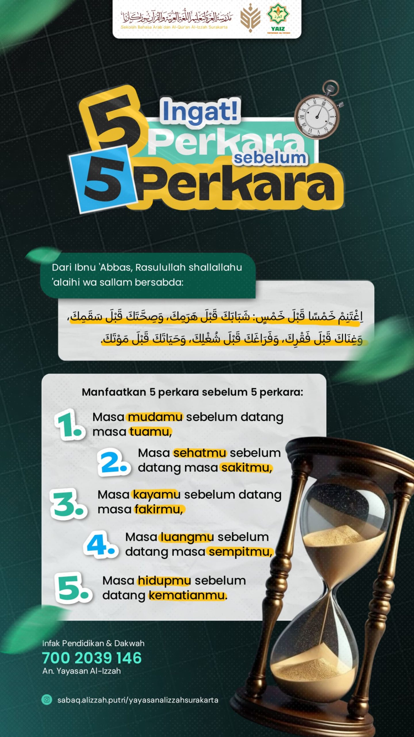 •┈┈┈┈┈┈•✿﷽✿•┈┈┈┈┈┈• “Masa mudamu sebelum datang masa tuamu, masa sehatmu sebelum datang masa sakitmu, masa kayamu sebelum datang masa fakirmu, masa luangmu sebelum datang masa sempitmu, masa hidupmu sebelum datang kematianmu.” ●◉◎◈◎◉● Follow us, https://www.instagram.com/sabaq.alizzah.putri https://www.instagram.com/yayasanalizzahsurakarta