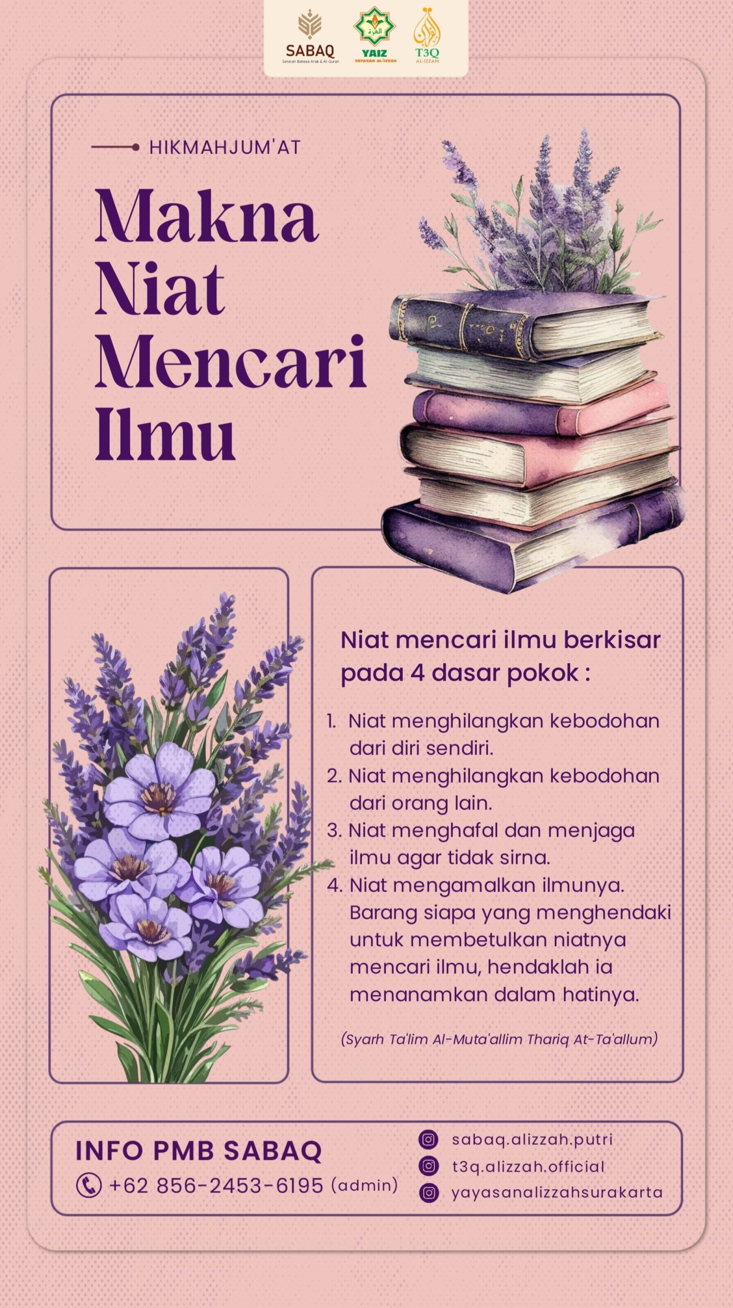 Niat mencari ilmu berkisar pada 4 dasar pokok : 1. Niat menghilangkan kebodohan dari diri sendiri. 2. Niat menghilangkan kebodohan dari orang lain. 3. Niat menghafal dan menjaga ilmu agar tidak sirna. 4. Niat mengamalkan ilmunya. Barang siapa yang menghendaki untuk membetulkan niatnya mencari ilmu, hendaklah ia menanamkan dalam hatinya. (Syarh Ta’lim Al-Muta’allim Thariq At-Ta’allum)