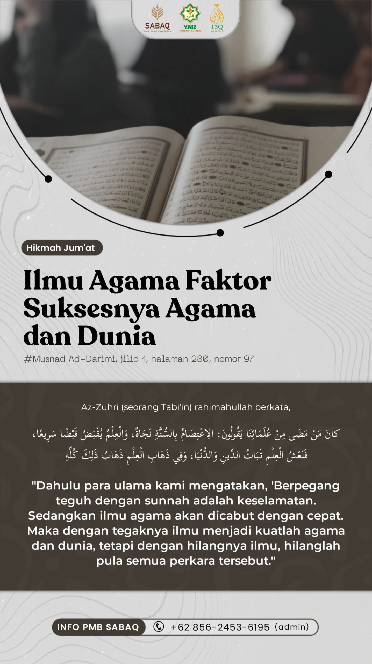 ┈┉┉━✿ Bismillahirrahmanirrahim ✿━┉┉┈ ILMU AGAMA FAKTOR SUKSESNYA AGAMA DAN DUNIA Az-Zuhri (seorang Tabi’in) rahimahullah berkata, كانَ مَنْ مَضَى مِنْ عُلَمَائِنَا يَقُولُونَ: الِاعْتِصَامُ بِالسُّنَّةِ نَجَاةٌ، وَالْعِلْمُ يُقْبَضُ قَبْضًا سَرِيعًا، فَنَعْشُ الْعِلْمِ ثَبَاتُ الدِّينِ وَالدُّنْيَا، وَفِي ذَهَابِ الْعِلْمِ ذَهَابُ ذَلِكَ كُلِّهِ “Dahulu para ulama kami mengatakan, ‘Berpegang teguh dengan sunnah adalah keselamatan. Sedangkan ilmu agama akan dicabut … Baca Selengkapnya