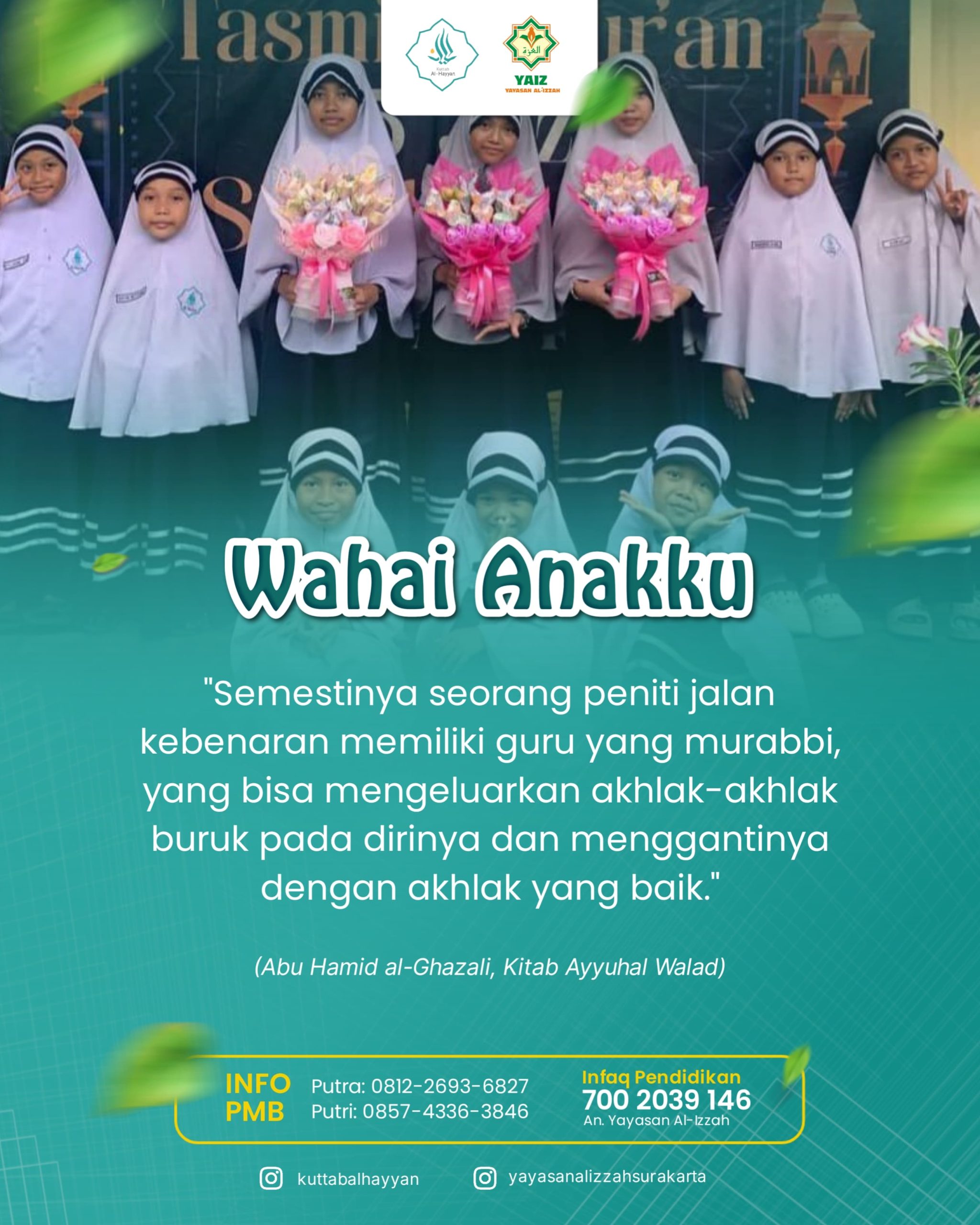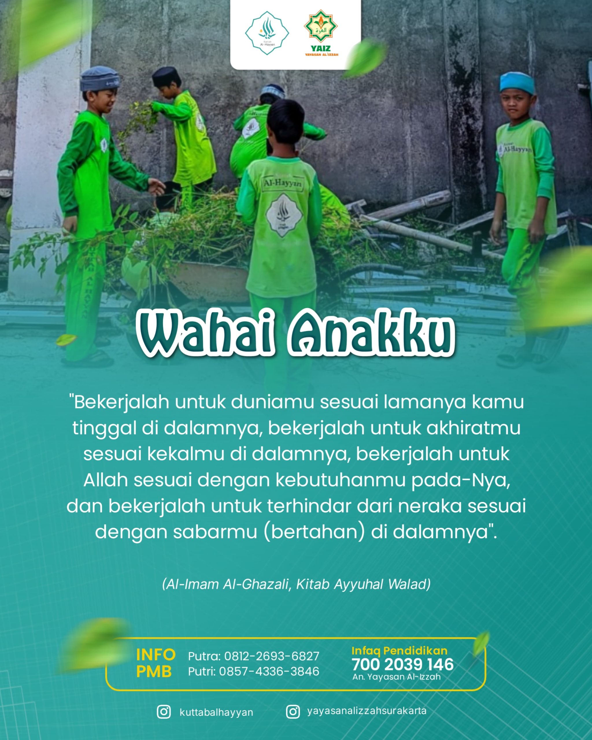 •┈┈┈┈┈┈•✿﷽✿•┈┈┈┈┈┈• “Wahai anakku, bekerjalah untuk duniamu sesuai lamanya kamu tinggal di dalamnya, bekerjalah untuk akhiratmu sesuai kekalmu di dalamnya, bekerjalah untuk Allah sesuai dengan kebutuhanmu pada-Nya, dan bekerjalah untuk terhindar dari neraka sesuai dengan sabarmu (bertahan) di dalamnya”. (Imam Al-Ghazali, Ayyuhal Walad