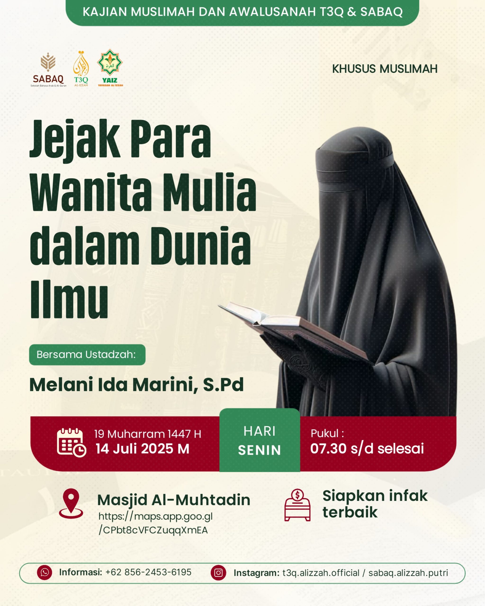 🌸🍃 بسم الله الرحمن الرحيم 🍃🌸 KAJIAN KHUSUS MUSLIMAH DAN AWALUSANAH 💫 Jejak Para Wanita Mulia dalam Dunia Ilmu 🧕🏻Ustadzah Melani Ida Marini, S.Pd 📆 Hari : Senin, 19 Muharram 1447 H/ 14 Juli 2025 M ⏰ Waktu : Pukul 07.30 s/d selesai 🏠 Tempat : Masjid Al-Muhtadin https://maps.app.goo.gl/CPbt8cVFCZuqqXmEA 🎁 Siapkan infak terbaik ➖➖➖➖➖➖➖➖➖