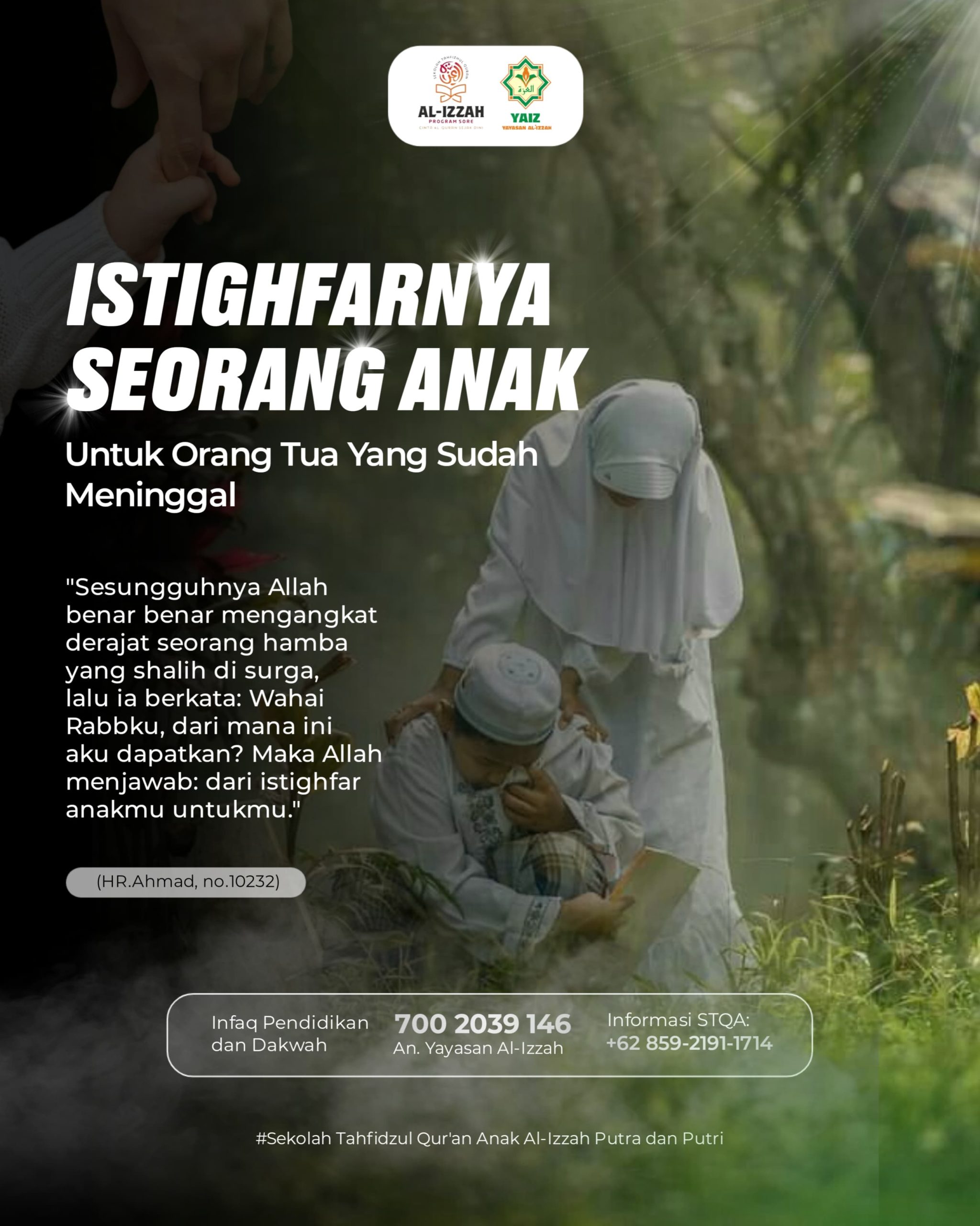 Istighfarnya seorang anak untuk orang tua yang sudah meninggal 5 Agustus 2025 oleh Yayasan Al-Izzah Surakarta •┈┈┈┈┈┈•✿﷽✿•┈┈┈┈┈┈• “Sesungguhnya Allah benar benar mengangkat derajat seorang hamba yang shalih di surga, lalu ia berkata: Wahai Rabbku, dari mana ini aku dapatkan? Maka Allah menjawab: dari istighfar anakmu untukmu.” (HR. Ahmad no.10232)